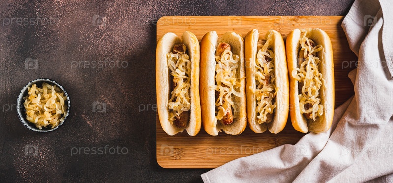 Вкусные хот-доги с говяжьей колбасой и жареным луком на доске вид сверху веб-баннер