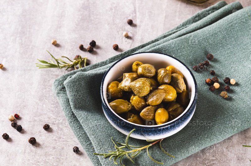 Маринованные каперсы в миске, розмарин и перец горошком на столе