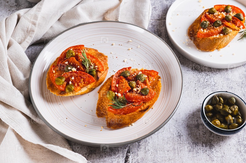 Итальянские кростини с вялеными томатами, каперсами и специями на тарелке на столе