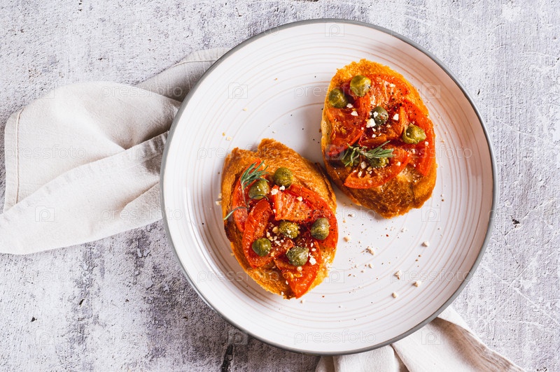 Крупный план брускетты с сушеными томатами и маринованными каперсами на тарелке на столешнице