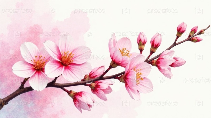Акварельный стиль, веточка цветущей сакуры на нежно-розовом фоне