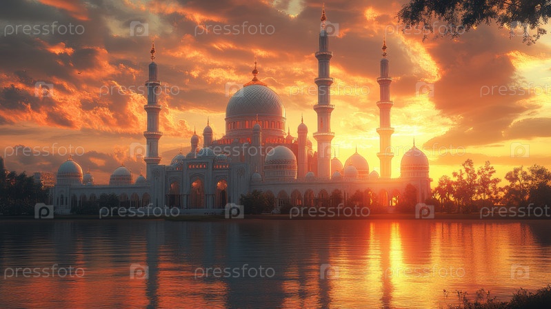 Величественная мечеть с замысловатой исламской архитектурой на фоне потрясающего заката или восхода солнца, золотистые и теплые тона, освещающие небо, мягкие светящиеся облака
