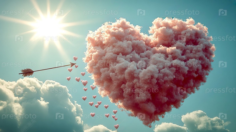 Стрела Купидона летит к розовому сердцу из облаков на фоне голубого неба в солнечных лучах