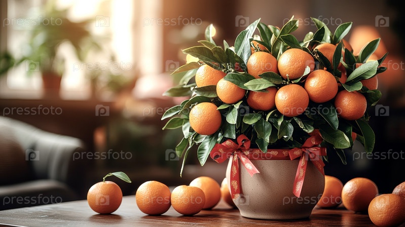 Канун Лунного Нового года, символ праздника — мандариновое дерево с красной лентой, стоящее на столе в гостиной