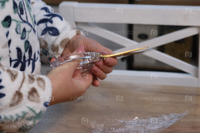 Женщина рассматривает ножницы. Она распаковывает и рассматривает свою покупку