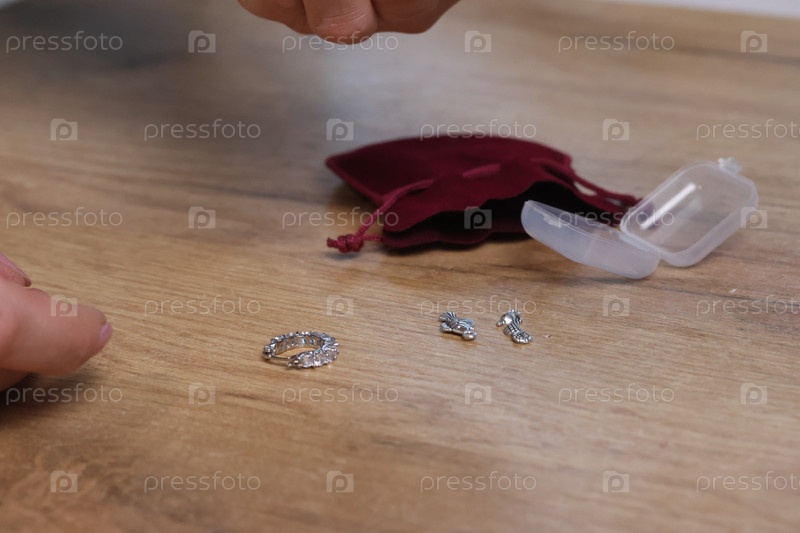 Женщина рассматривает серьги с камнями. Серьги упакованы в мешочек. Крупный план