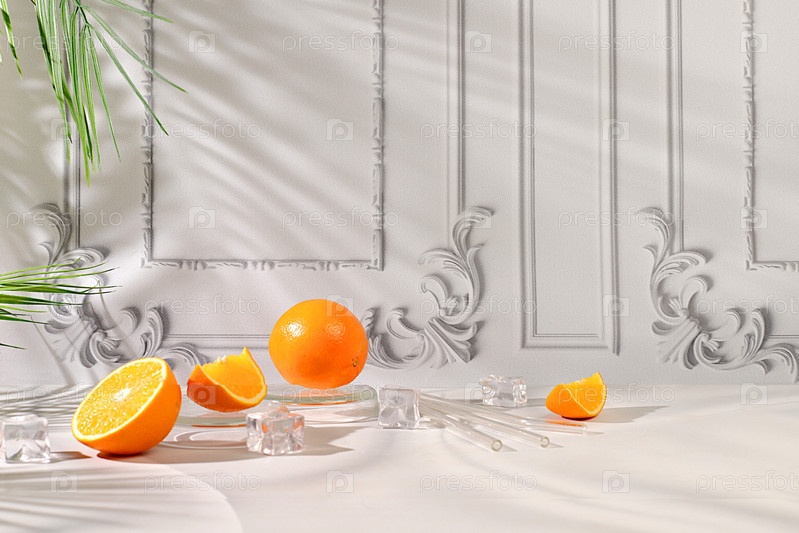 Современный натюрморт с цитрусовыми, дольками апельсина и кубиками льда на элегантном фоне с тенями, концепция минимальной детокс-диеты, реклама летней вечеринки с витаминными напитками, выборочный фокус, место для текста