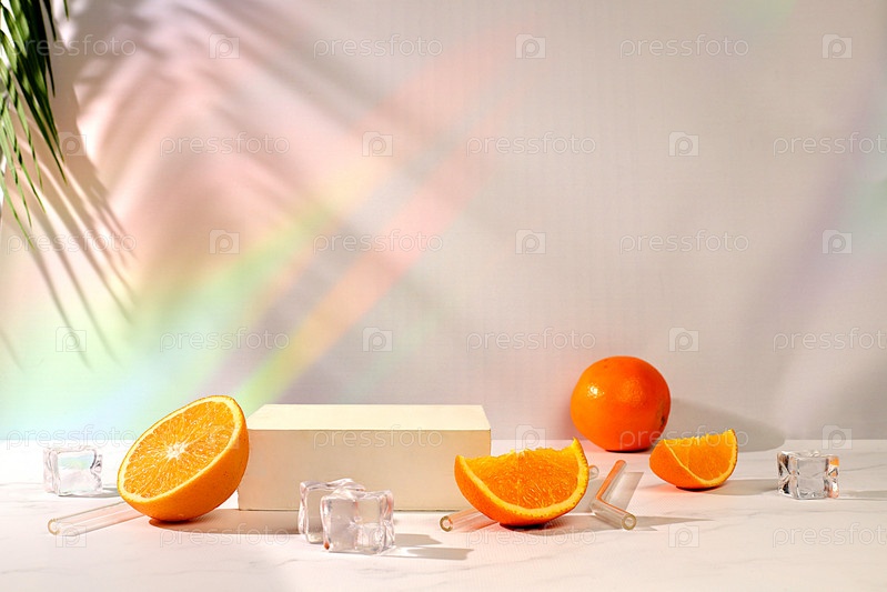 Современный натюрморт с цитрусовыми, дольками апельсина и кубиками льда на солнечном фоне с тенями, концепция минимальной детокс-диеты, реклама летней вечеринки с витаминными напитками, выборочный фокус, место для текста