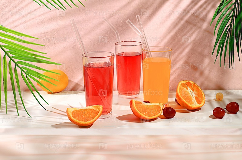 Современный натюрморт с цитрусовым, апельсиновым и виноградным соком, апельсины и виноград на пастельном фоне с тенями, концепция минимальной детокс-диеты, реклама летней вечеринки с витаминными напитками, выборочный фокус, место для текста