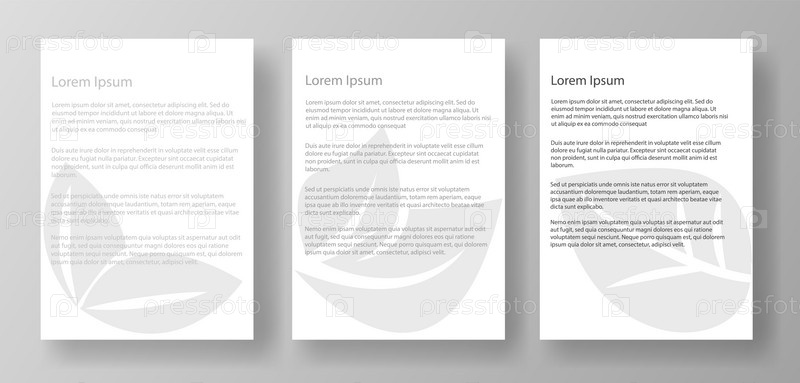Три шаблона макетов писем формата А4 с текстом lorem ipsum и цветочным водяным знаком. Документы отображаются на светло-сером фоне. Концепция дизайна макета документа. Векторная иллюстрация