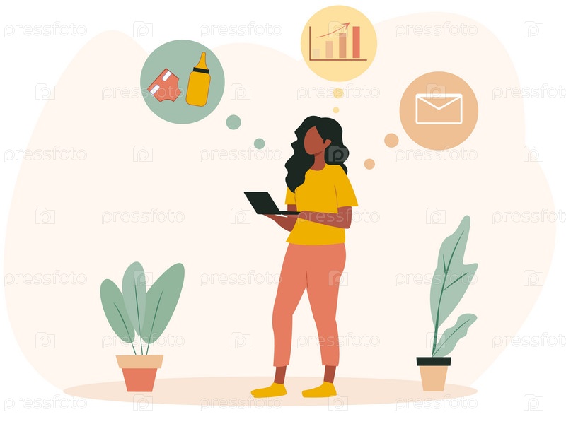 Женщина стоит с планшетом, окруженная значками, представляющими бизнес, материнство и онлайн-медиа. Минималистичный стиль со светлым фоном. Концепция многозадачности и баланса между работой и личной жизнью