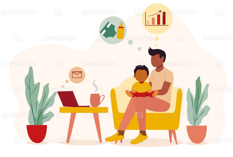 Отец, находящийся в декретном отпуске, удобно расположился на желтом диване, держа на руках ребенка, и управляя рабочими задачами с помощью ноутбука, находящегося рядом