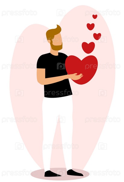 Векторная иллюстрация мужчины, держащего красное сердце в День святого Валентина, на фоне плавающих сердечек