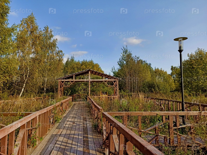 Москва, Россия-08.2020: Деревянная дорожка, прогулочный маршрут в парке «Долгие пруды» на севере Москвы