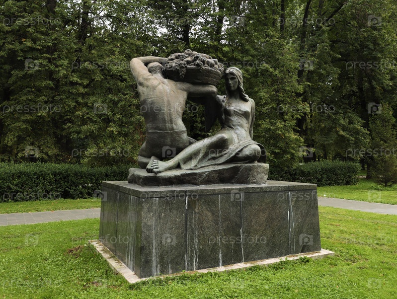 Парк Дружбы, Москва, Россия - апрель 2022 г.: бронзовая скульптура «Урожай», мужчина несет на плечах огромную корзину овощей и фруктов, женщина ему помогает