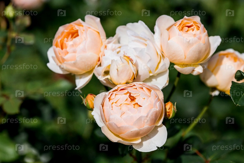 Пышная кустовая роза, изящная веточка и бутоны. Красивый солнечный свет. Естественный, цветущий, экологически чистый природный фон