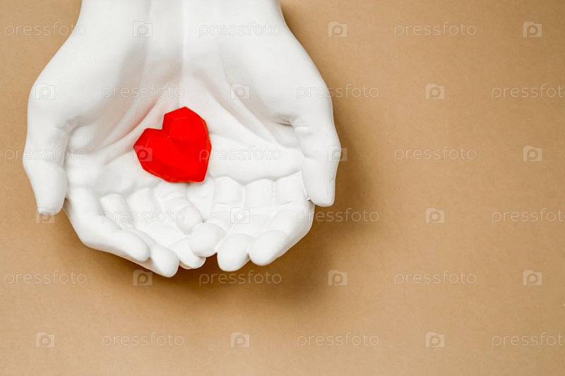 Стильный баннер. В руках красное сердце на бежевом фоне, сделанное из гипса. Всемирный день здоровья, любви и страхования. Всемирный день сердца, здоровья и донорства органов