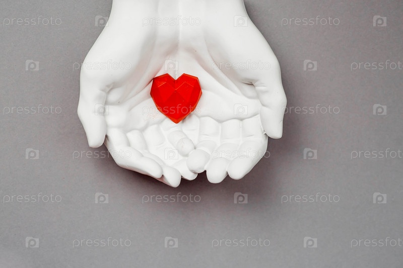 Стильный баннер. В руках красное сердце на сером фоне, сделанное из гипса. Всемирный день здоровья, любви и страхования. Всемирный день сердца, здоровья и донорства органов