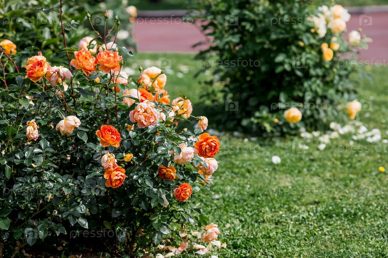 Пышная кустовая роза, изящная веточка и бутоны. Красивый солнечный свет. Естественный, цветущий, экологически чистый природный фон