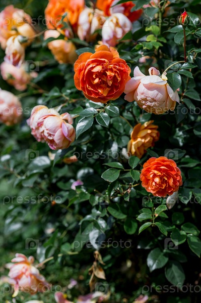 Пышная кустовая роза, изящная веточка и бутоны. Красивый солнечный свет. Естественный, цветущий, экологически чистый природный фон