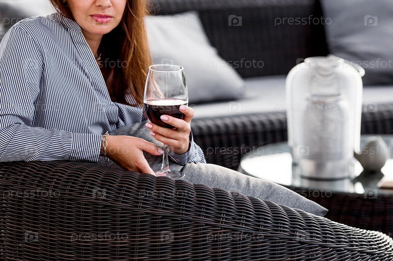 Бокал красного алкогольного напитка или вина в руке женщины. Женщина отдыхает на веранде загородного дома. Концепция релаксации, вечеринки или празднования