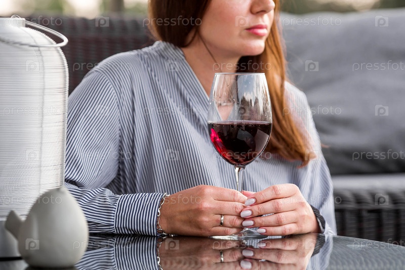 Бокал красного алкогольного напитка или вина в руке женщины. Женщина отдыхает на веранде загородного дома. Концепция релаксации, вечеринки или празднования