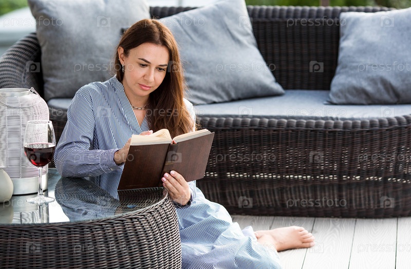Женщина отдыхает на веранде загородного дома и читает книгу за бокалом красного алкогольного напитка или вина. Концепция релаксации и роскошного вина
