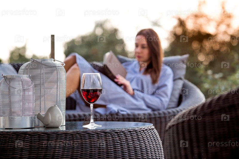 Женщина отдыхает на веранде загородного дома и читает книгу за бокалом красного алкогольного напитка или вина. Концепция релаксации и роскошного вина