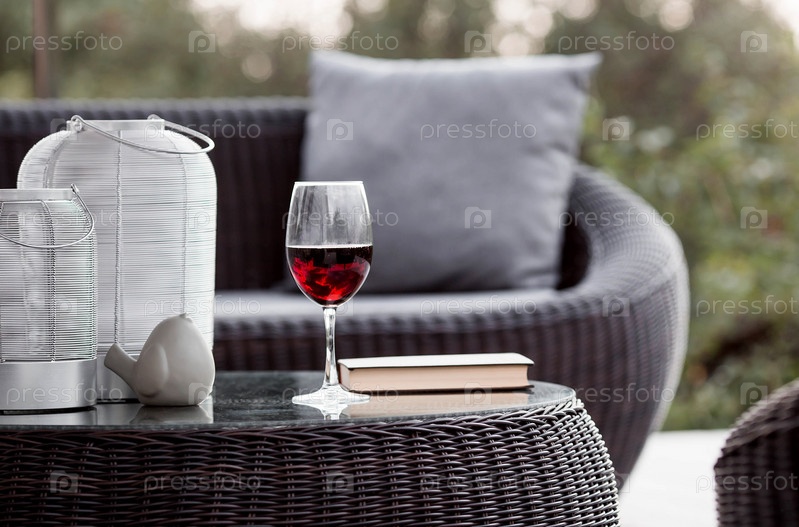 Бокал красного алкогольного напитка или вина на стеклянном столе на веранде. Понятие алкоголизма, вечеринки или праздника