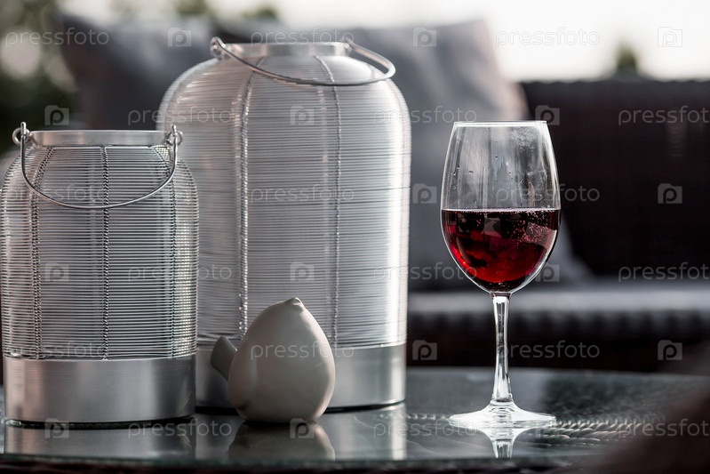 Бокал красного алкогольного напитка или вина на стеклянном столе на веранде. Понятие алкоголизма, вечеринки или праздника