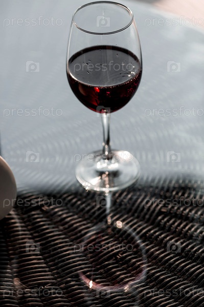 Бокал красного алкогольного напитка или вина на стеклянном столе на веранде. Понятие алкоголизма, вечеринки или праздника