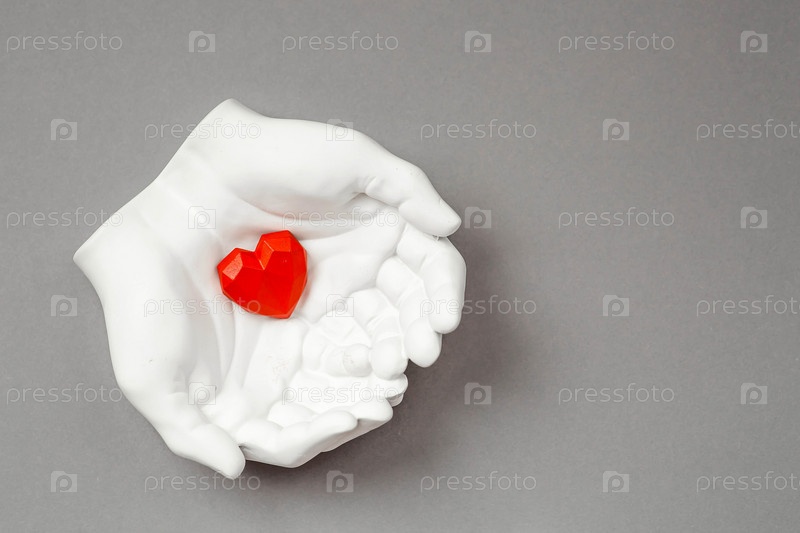 Стильный баннер. В руках красное сердце на сером фоне, сделанное из гипса. Всемирный день здоровья, любви и страхования. Всемирный день сердца, здоровья и донорства органов