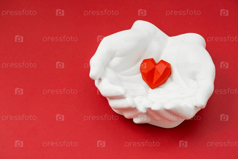 Стильный баннер. В руках красное сердце на красном фоне, сделанное из гипса. Всемирный день здоровья, любви и страхования. Всемирный день сердца, здоровья и донорства органов