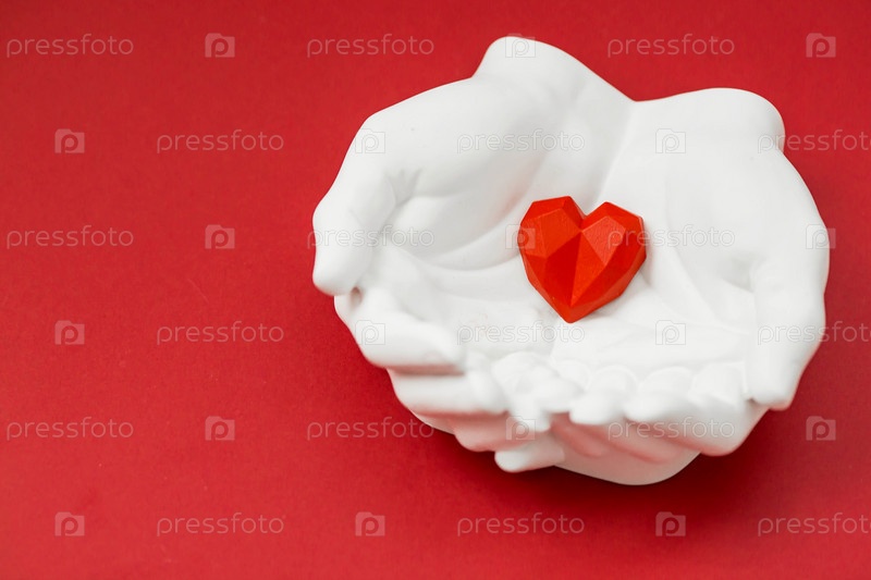 Стильный баннер. В руках красное сердце на красном фоне, сделанное из гипса. Всемирный день здоровья, любви и страхования. Всемирный день сердца, здоровья и донорства органов