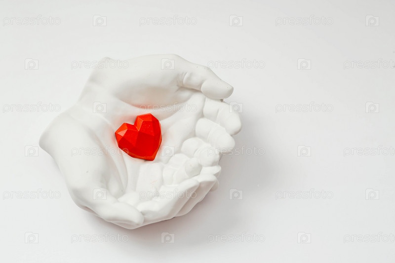 Стильный баннер. В руках красное сердце на белом фоне, сделанное из гипса. Всемирный день здоровья, любви и страхования. Всемирный день сердца, здоровья и донорства органов