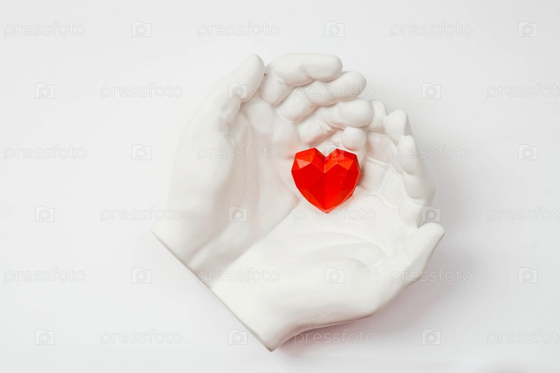 Стильный баннер. В руках красное сердце на белом фоне, сделанное из гипса. Всемирный день здоровья, любви и страхования. Всемирный день сердца, здоровья и донорства органов