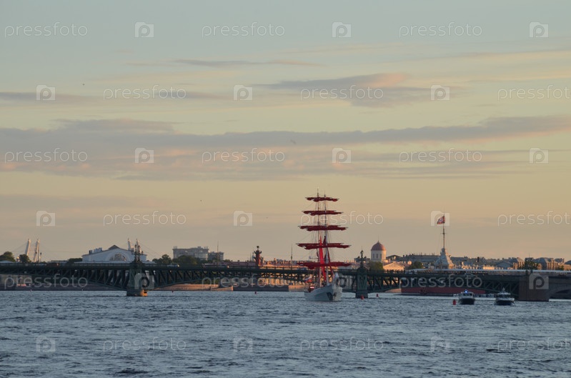 Бриг Россия со свернутыми парусами алого цвета в акватории Невы на репетиции праздника для выпускников Алые паруса в Санкт-Петербурге в июне 2024
