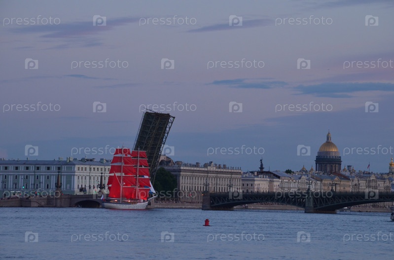 Бриг Россия с развернутыми парусами алого цвета на фоне разведенного Троицкого моста на репетиции праздника для выпускников Алые паруса в Санкт-Петербурге в июне 2024