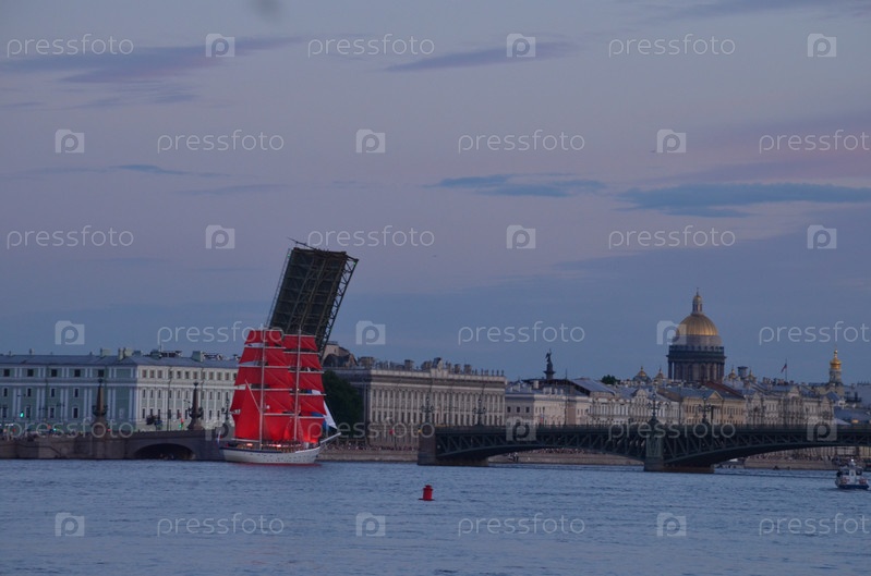 Бриг Россия с развернутыми парусами алого цвета на фоне разведенного Троицкого моста на репетиции праздника для выпускников Алые паруса в Санкт-Петербурге в июне 2024