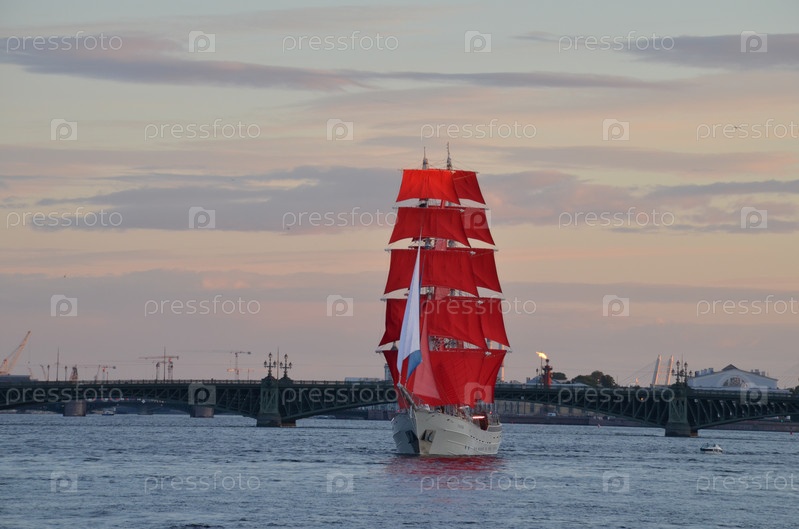 Бриг Россия с развернутыми парусами алого цвета в акватории Невы на репетиции праздника для выпускников Алые паруса в Санкт-Петербурге в июне 2024