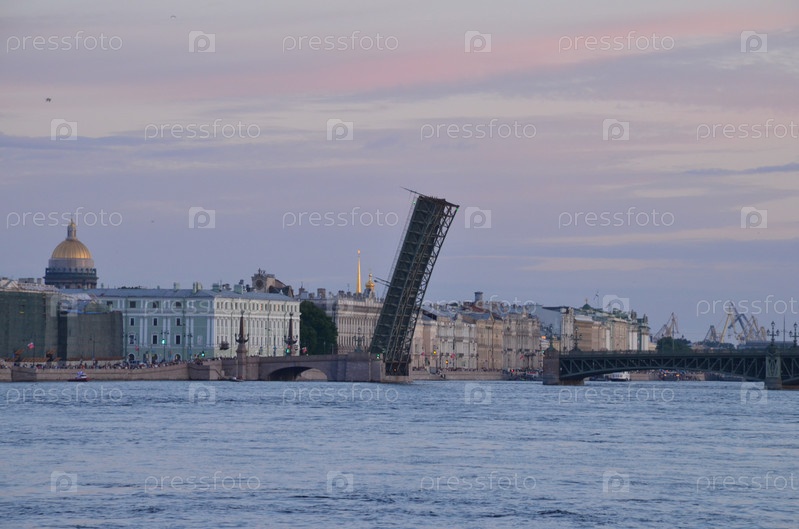 Разведенный Троицкий мост на закате в Санкт-Петербурге