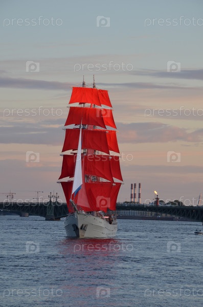 Бриг Россия с развернутыми парусами алого цвета в акватории Невы на репетиции праздника для выпускников Алые паруса в Санкт-Петербурге в июне 2024