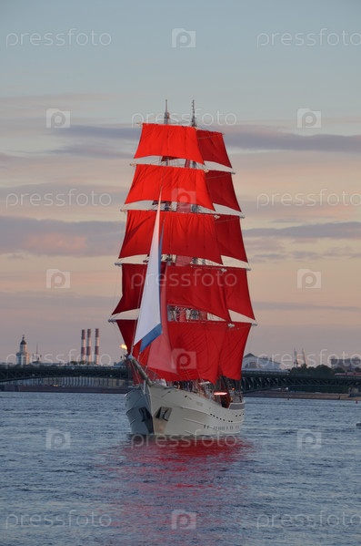 Бриг Россия с развернутыми парусами алого цвета в акватории Невы на репетиции праздника для выпускников Алые паруса в Санкт-Петербурге в июне 2024