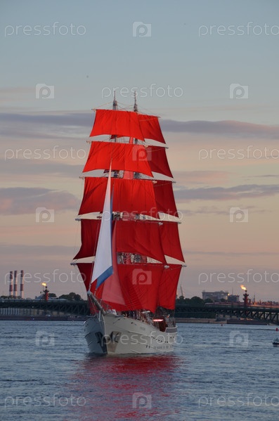 Бриг Россия с развернутыми парусами алого цвета в акватории Невы на репетиции праздника для выпускников Алые паруса в Санкт-Петербурге в июне 2024