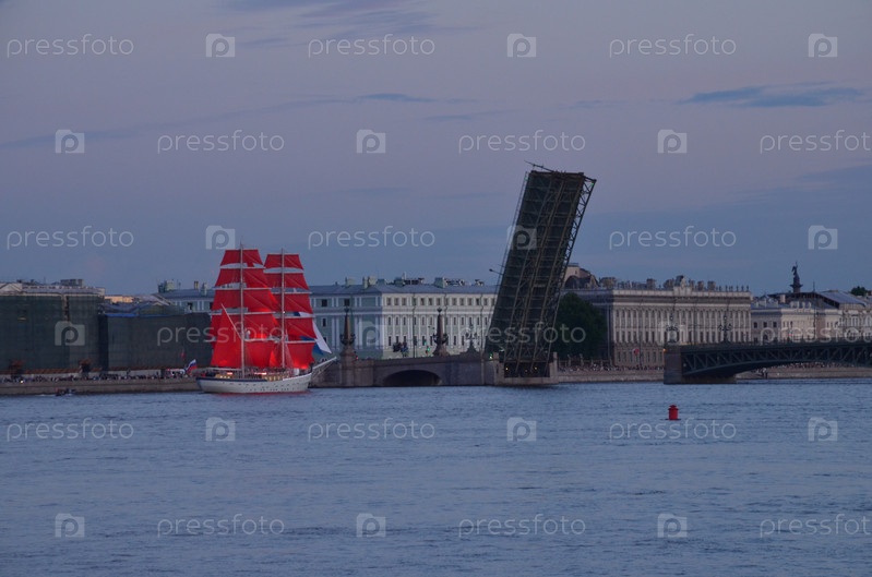 Бриг Россия с развернутыми парусами алого цвета на фоне разведенного Троицкого моста на репетиции праздника для выпускников Алые паруса в Санкт-Петербурге в июне 2024