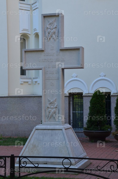 Поклонный крест церкви святой блаженной Ксении Петербургской на Лахтинской улице в Петроградском районе Санкт-Петербурга в солнечный ясный день