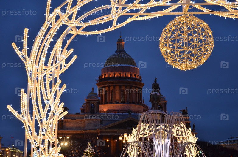 Вид на Исаакиевский собор и памятник царю Николаю I на фоне новогодних украшений зимнего сада на Синем мосту через реку Мойка в Санкт-Петербурге