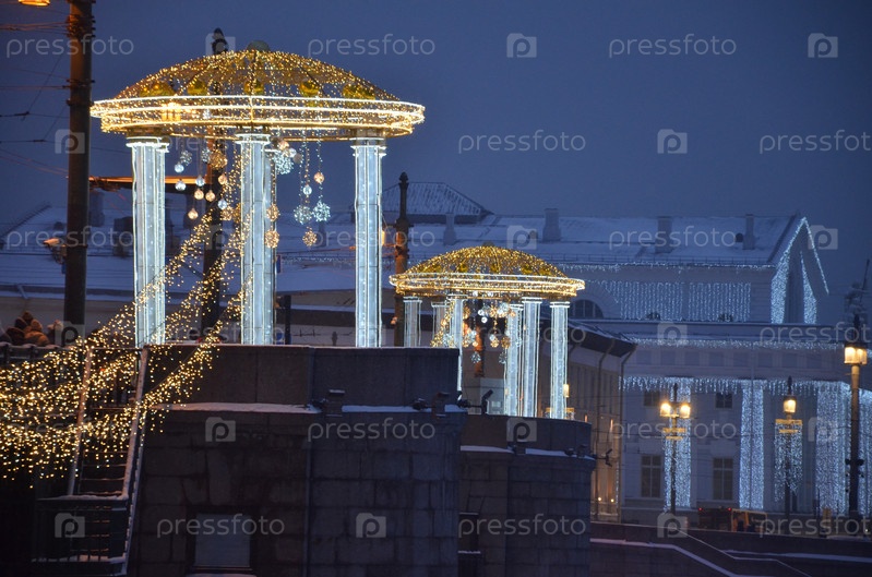 Новогоднее украшение Дворцового моста в Санкт-Петербурге, на заднем фоне здание Биржи