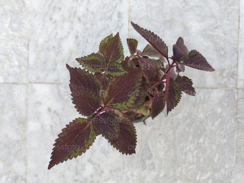Сорт колеуса с листьями зеленого цвета снаружи и темно-бордового оттенка с внутренней стороны, высаженный в черный пластиковый горшок