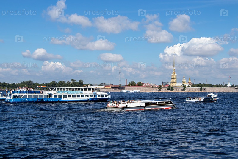 Санкт-Петербург,Россия, 8 июля 2020, Петропавловская крепость. На фото Петропавловская крепость и катера с туристами, вид с Дворцовой набережной